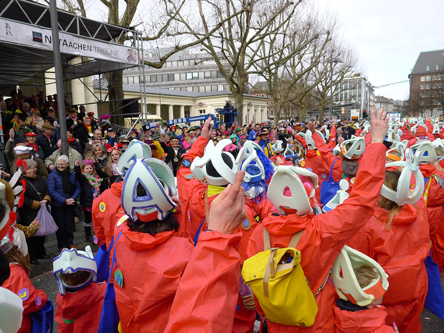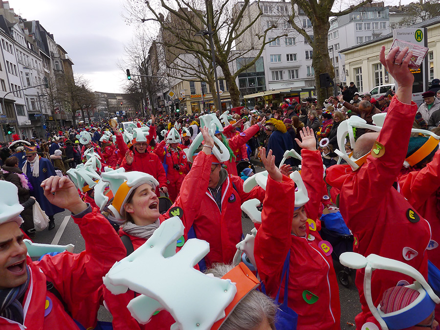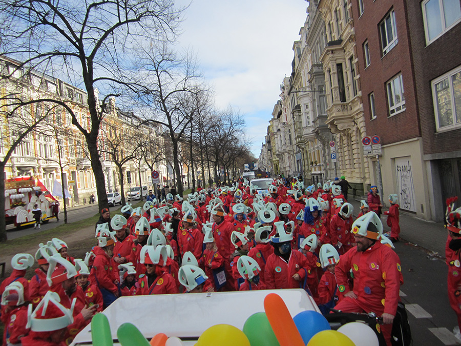 Als rot gekleidete Buchstaben, die den Schriftzug "Höfling-Alaaf" bilden konnten, zogen fast 200 Höflinge am Karnevalssonntag durch die Stadt. Unter dem Motto "Et jecke ABC erop än erav - Höfling-Alaaf" verbreiteten sie bei frühlingshaftem Wetter reichlich gute Laune und genossen das karnevalistische Treiben in Aachens Straßen. Die Kinder brachten auf ihrem Weg zwei Wagenladungen Süßigkeiten unter das Volk, darunter wieder einen großen Teil fair gehandelter Kamellen aus dem Weltladen. Kurz hinter ihnen beendete Märchenprinz Luc I. den Zug, der mit Hofstaat und Garde am Fettdonnerstag erst den Schulkarneval am Höfling besucht hatte.